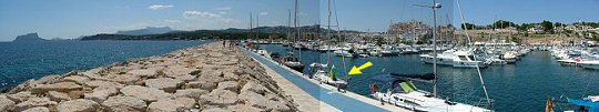 Iris berthed along the inner mole at Morayra (the rock on the far left horizon is Calpe)